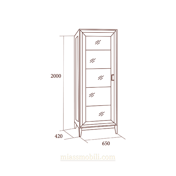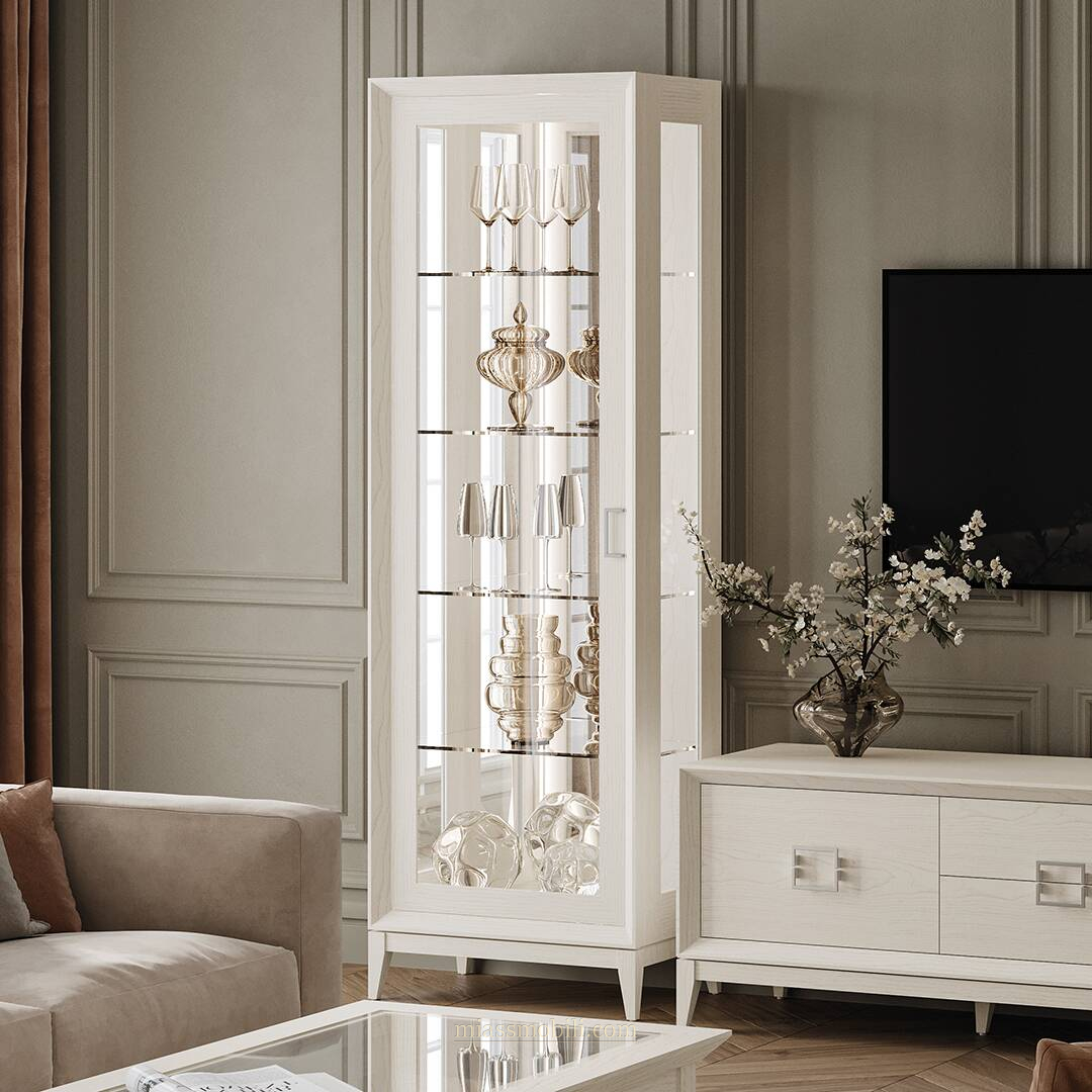 Шкаф 1-дв для посуды выполнен в стиле современная классика, с применением натуральных материалов массива и шпона ясеня. Задняя стенка зеркальная. В витрине установлена светодиодная подсветка.