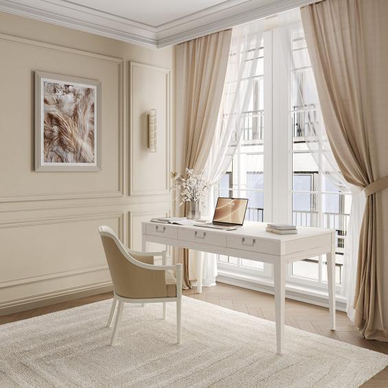Стол письменный из набора мебели Модена дуб Сатинвыполнен в стиле современная классика с применением натуральных материалов массива и шпона ясеня. Основной светлый цвет Сатин украшен серебристым оттенком пор, что придает поверхности легкое шелковистое мерцание. Полуглянцевая непрозрачная отделка набора выполнена светостойкими акриловыми материалами премиум класса. Габаритный размер указан по максимально выступающим частям