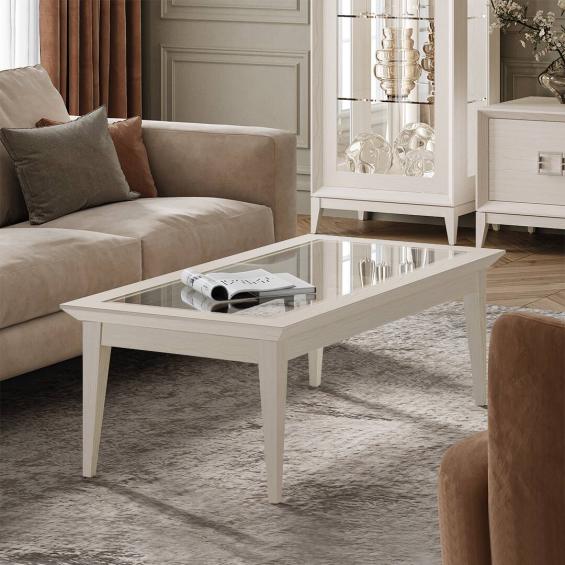 Стол журнальный из набора мебели Модена дуб Сатин выполнен в стиле современная классика, с применением натуральных материалов массива и шпона ясеня.