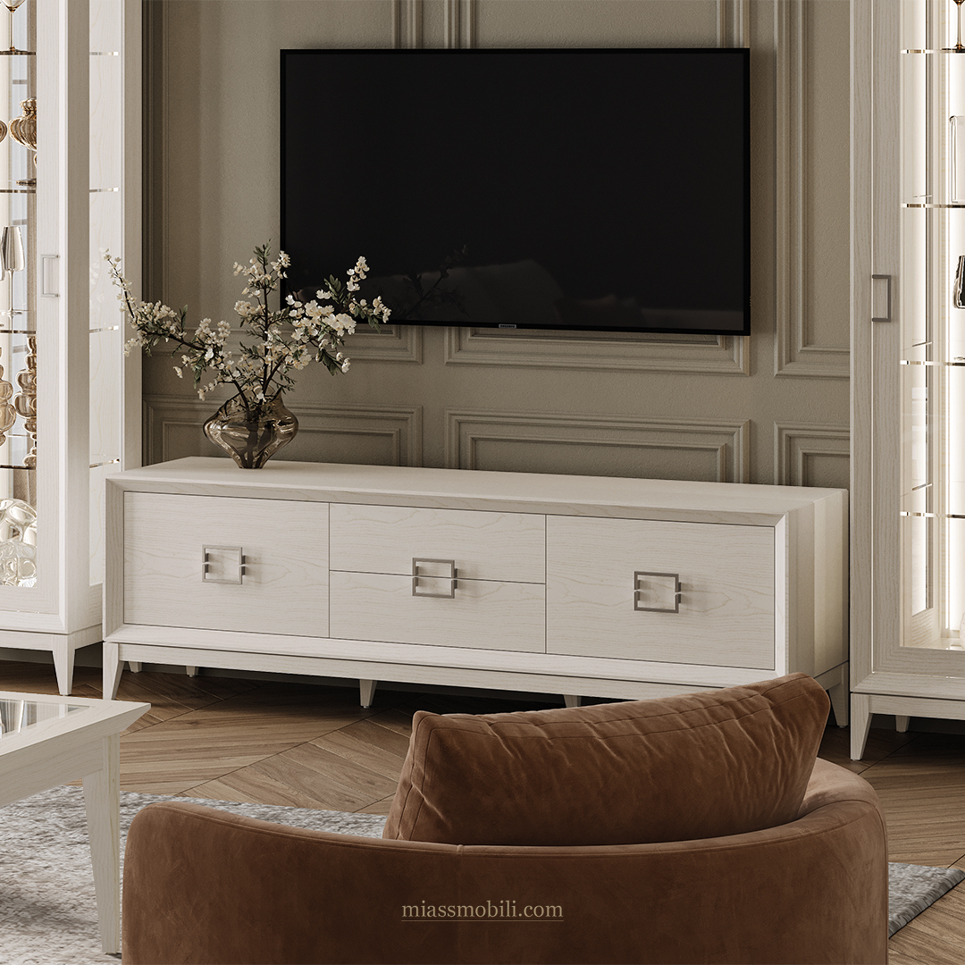 Тумба ТВ выполнена в стиле современная классика, с применением натуральных материалов массива и шпона ясеня. Ящики тумбы установлены на направляющие скрытого монтажа с системой доводки.