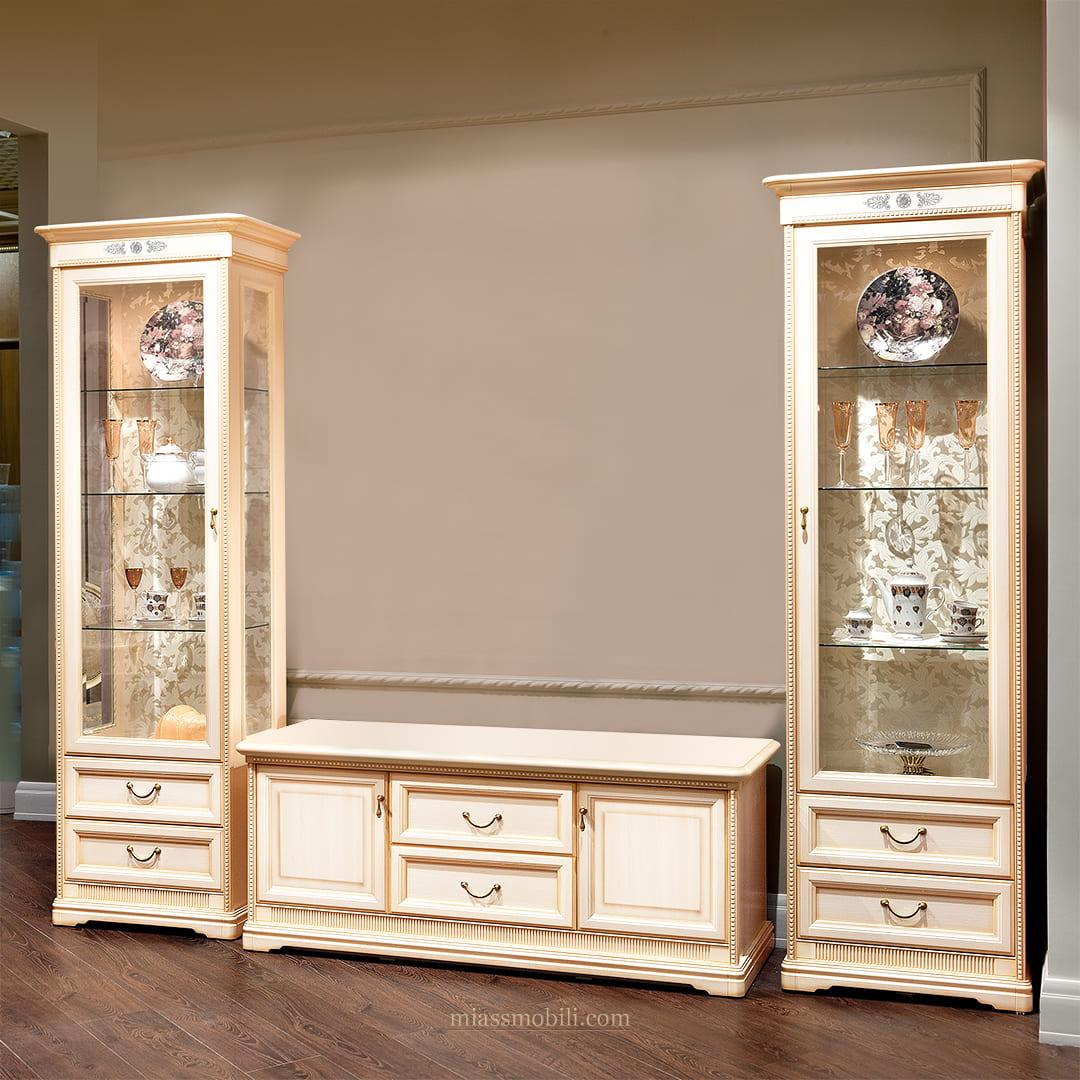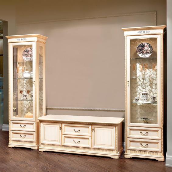 Тумба ТВ изготовлена в кремовом цвете с отделкой патиной. Фасад изделия декорирован накладными элементами.