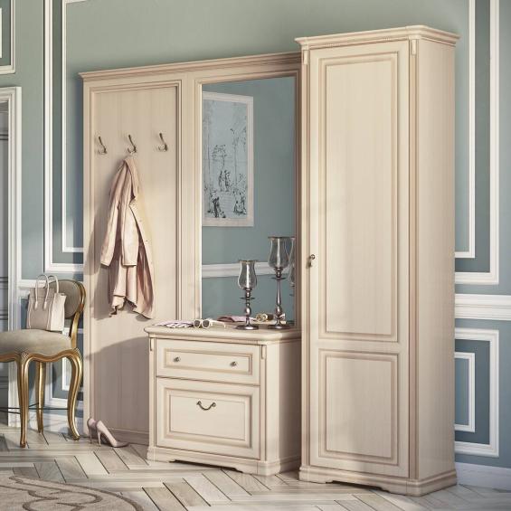 Шкаф однодверный правый для прихожей оборудован верхней полкой и выдвижной штангой для одежды. Кремовый цвет фасада оттеняет легкая патина.