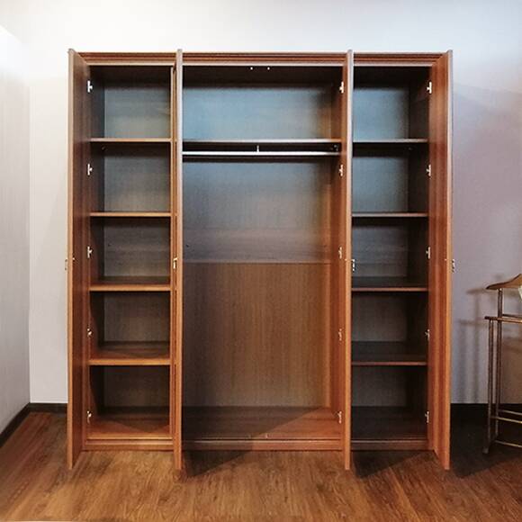 Шкаф 4-х дв выполнен в цвете орех. Шкаф имеет три отделения. В левой и правой части установлены полки. Центральное отделение шкафа оборудовано полкой и штангой для хранения верхней одежды.