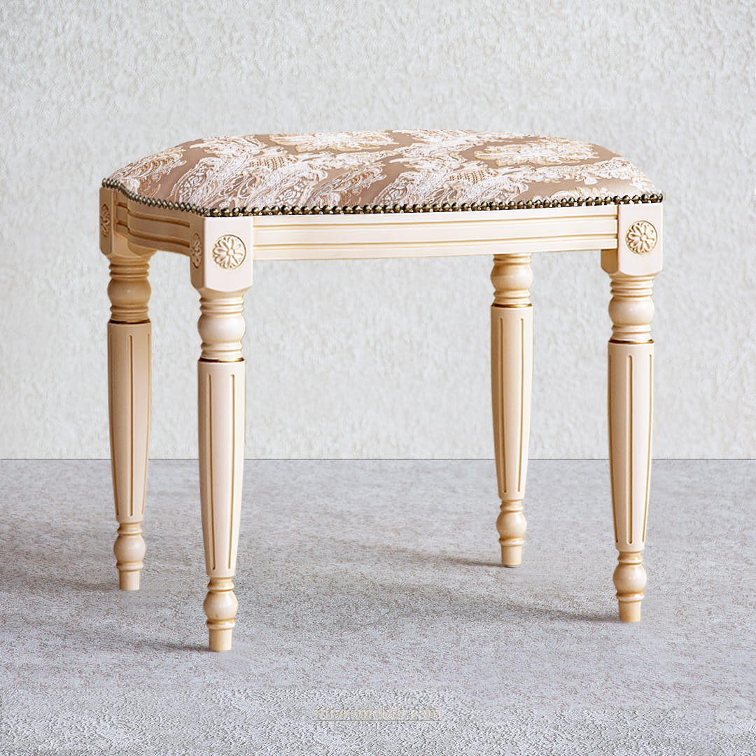 Банкетка изготовлена из массива березы с отделкой патиной. Сиденье драпировано мягкой тканью.