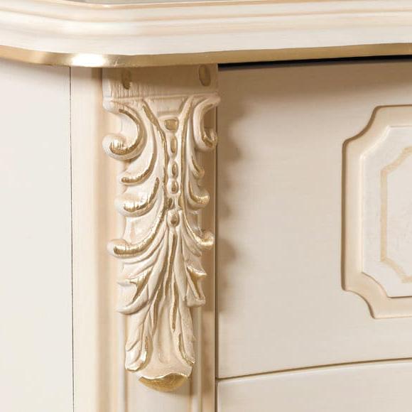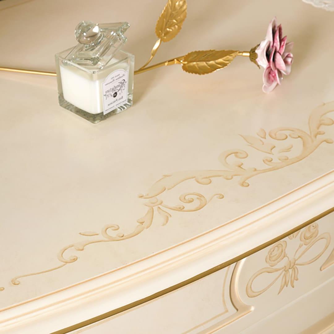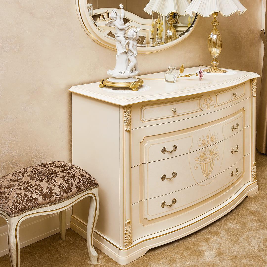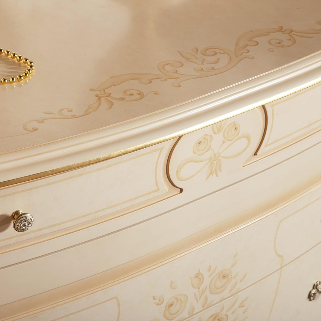 Комод декорирован художественной росписью ручной работы. В отделке используются позолоченные элементыс эффектом "состаривания". Выдвижные ящики комода оборудованы системой плавного закрывания - доводчиками.