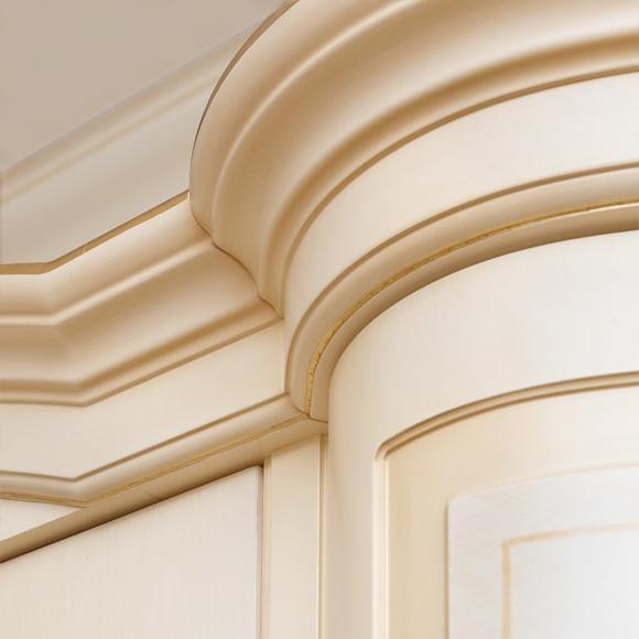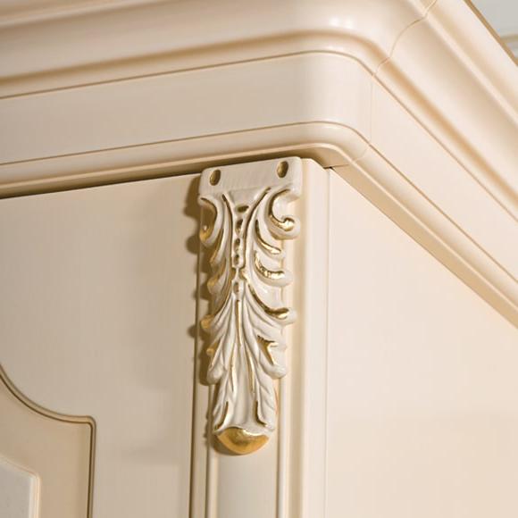 Шкаф 3-дверный декорирован ручной художественной росписью и элементами, покрытыми сусальным золотомс эффектом "состаривания". Центральная дверь шкафа оборудована зеркалом с изящной гравировкой и фацетом по периметру. Шкаф имеет два отделения. В левой части установлены полки для хранения белья, в правой части сверху установлена полка со штангой для верхней одежды, снизу также установлена большая полка. Двери оборудованы системой плавного закрывания (доводки).