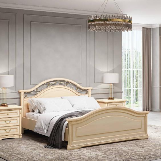 Головную спинку кровати украшает ажурная ковка и резные накладные декоративные элементы. Мебель выполнена в нежном кремовом цвете, отделка патиной.