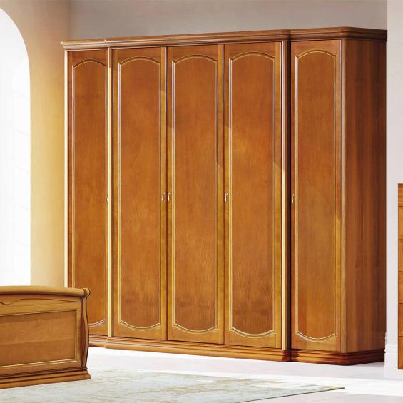 Шкаф пятидверный выполнен с использованием массива бука и шпона красного дерева анегри. Шкаф декорирован отделкой с золотом.
