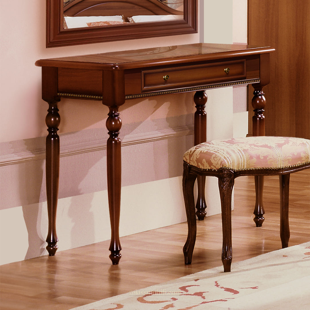 В отделке столешницы используются декоративные элементы ручной работы с легкой позолотой. Стол оборудован выдвижным ящичком для хранения украшений. Дно ящика драпировано тканью.