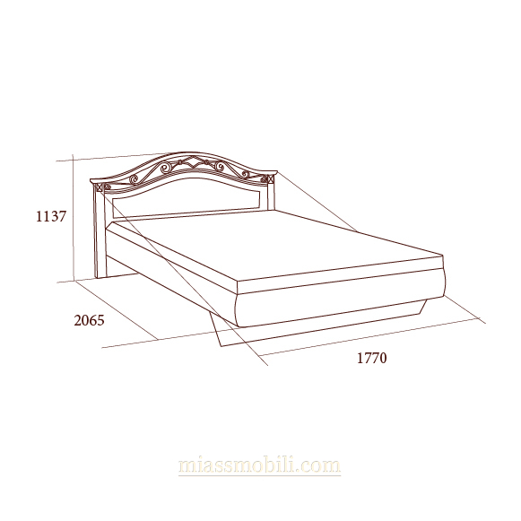Двуспальная кровать из коллекции мебели для дома с гнутой головной спинкой и кованым элементом, без ножной спинки. Головную спинку кровати украшает ажурная ковка и резные накладные декоративные элементы, покрытые золотом. Габаритный размер указан по максимально выступающим частям изделия.