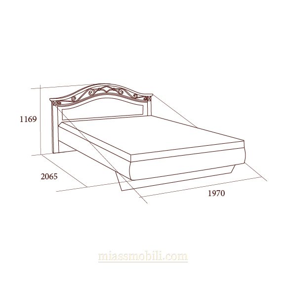 Двуспальная кровать из коллекции мебели для дома с гнутой головной спинкой и кованым элементом, без ножной спинки. Головную спинку кровати украшает ажурная ковка и резные накладные декоративные элементы, покрытые золотом.