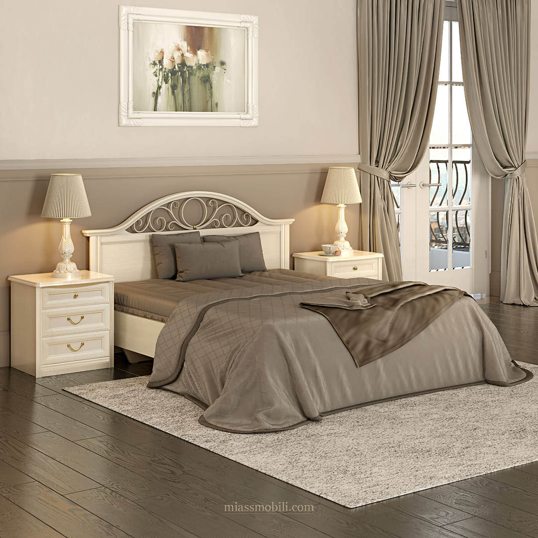 Двуспальная кровать с гнутой головной и без ножной спинки. Головная спинка декорирована кованым элементом.