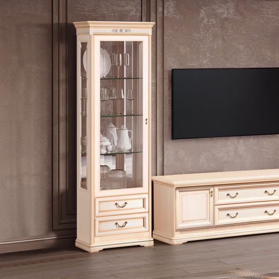 В верхней части установлена подсветка. Фасад витрины декорирован накладными элементами. Высококачественная фурнитура обеспечивает долгий срок эксплуатации.